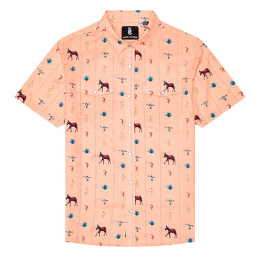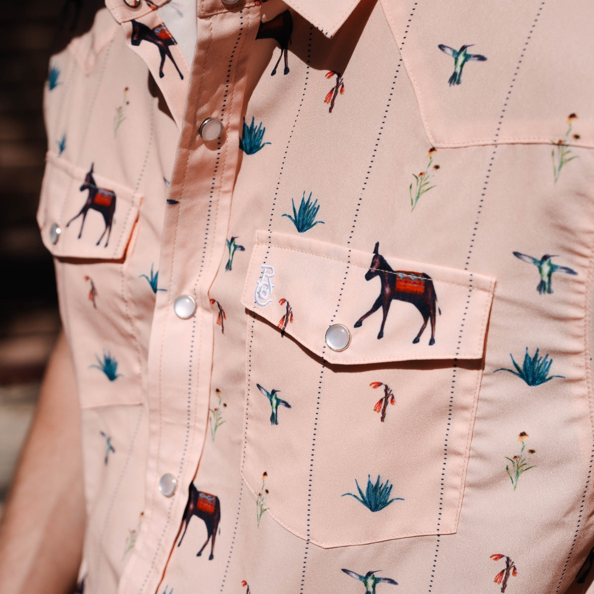 Our Burro Trail pearl snap western shirt features a donkey trail pattern, pearl snap button down, and embroidered RBC brand on the front pocket.