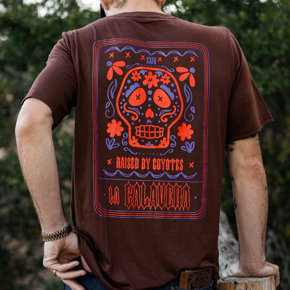 Our La Calavera Dia de los Muertos bootstitch pocket t-shirt.