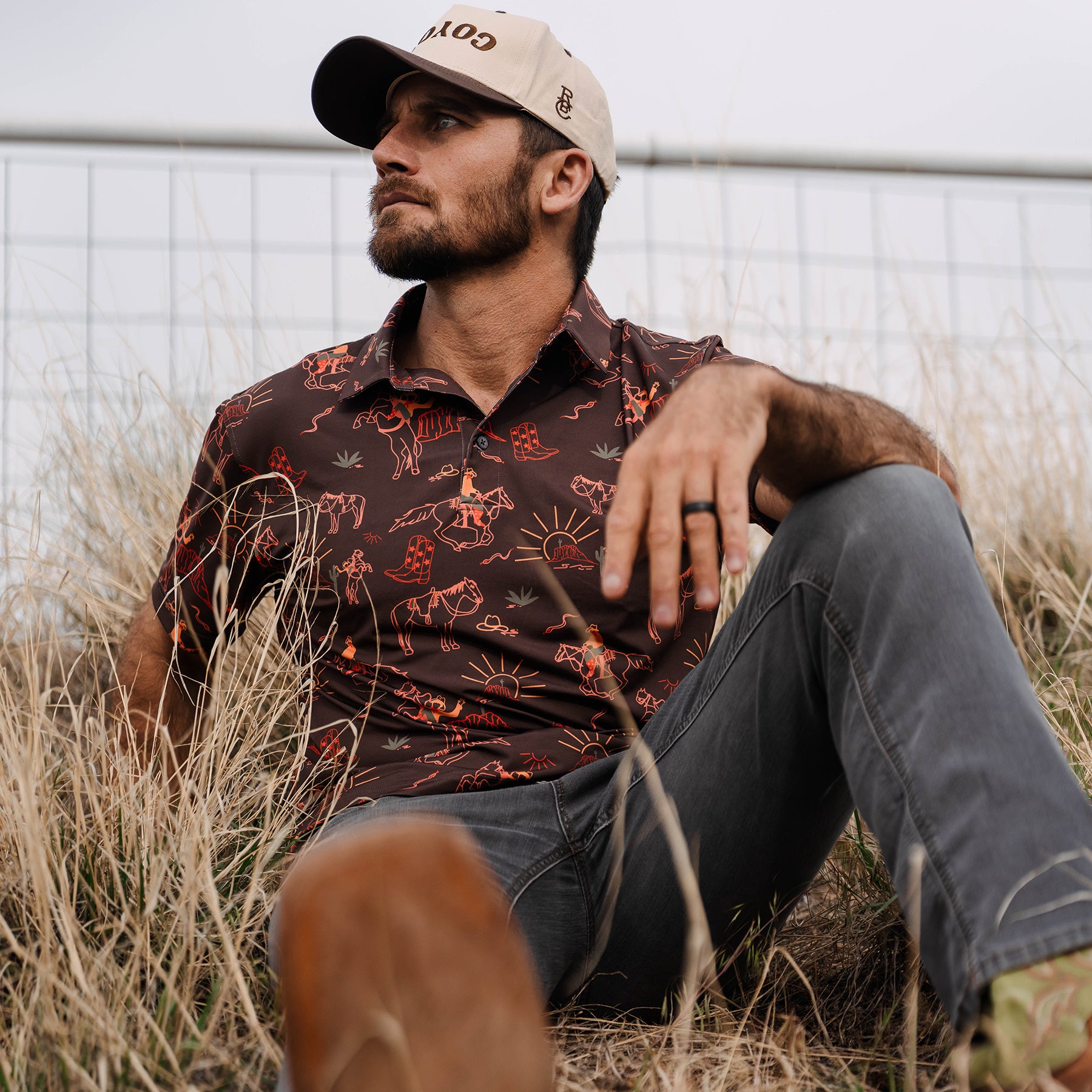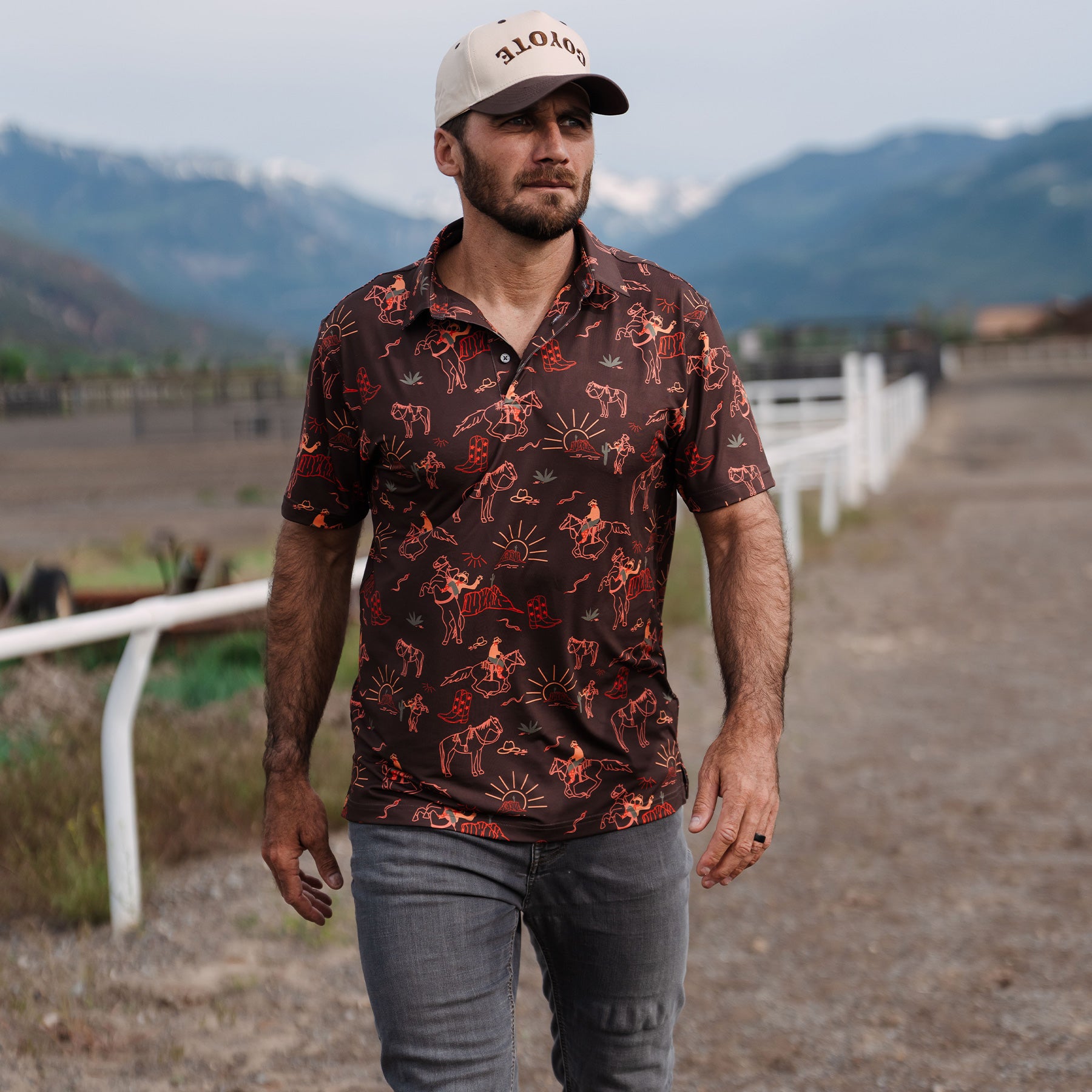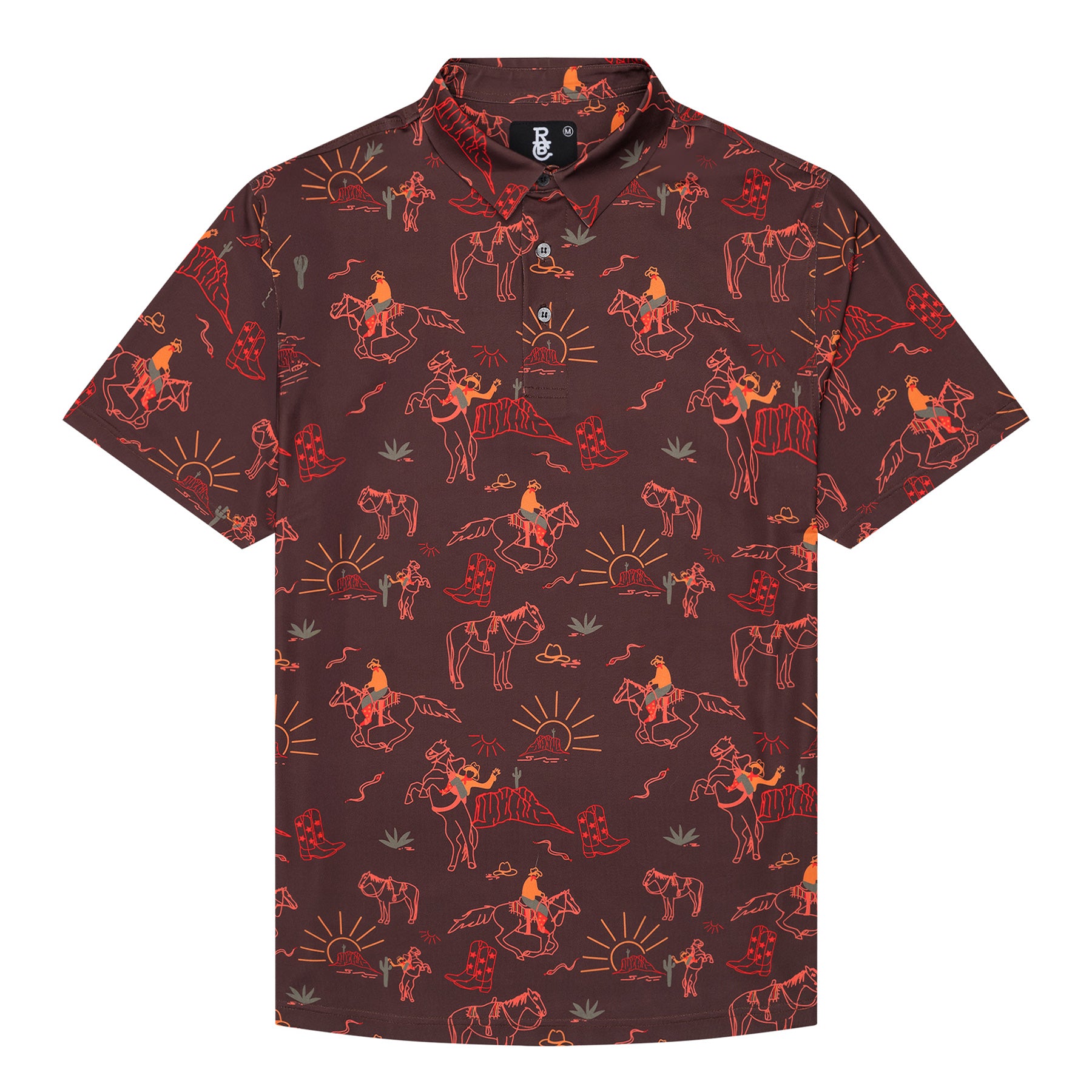 The Red Rock Rider Polo captures the untamed spirit of the desert with a design that features a cowboys and wild horses in the iconic red rock landscape. With rich Western tones and rugged energy, this polo blends bold style with all-day comfort. Made from our performance TexFlex fabric, it’s breathable, moisture-wicking, and built to move—whether you're out on the course or chasing the horizon. Desert vibes, cowboy grit—this one’s made to stand out.
