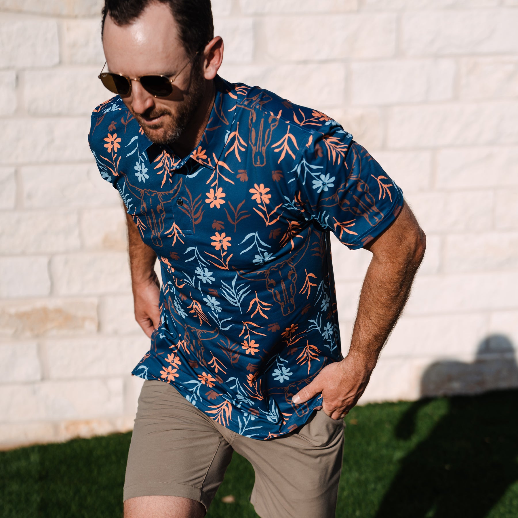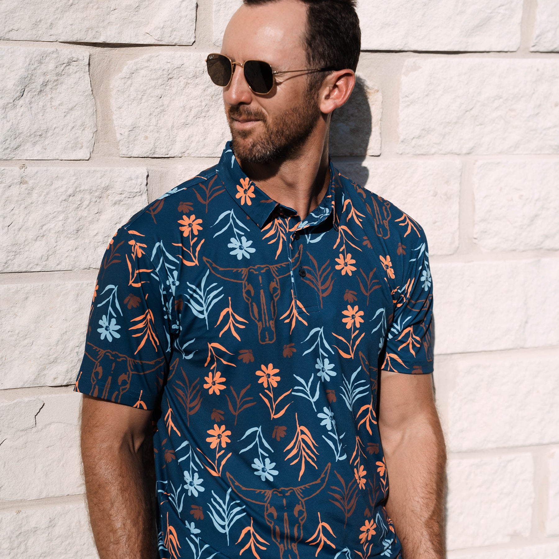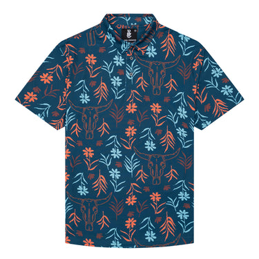 The Skulls & Daisies Polo puts a bold Western twist on floral. Featuring a mix of cow skulls and daisies, this standout print is made for those who like their style with a little grit. Crafted with our ultra-comfortable TexFlex fabric, it offers breathable stretch, sun protection, and moisture-wicking performance—perfect for long days on the course or out in the wild.