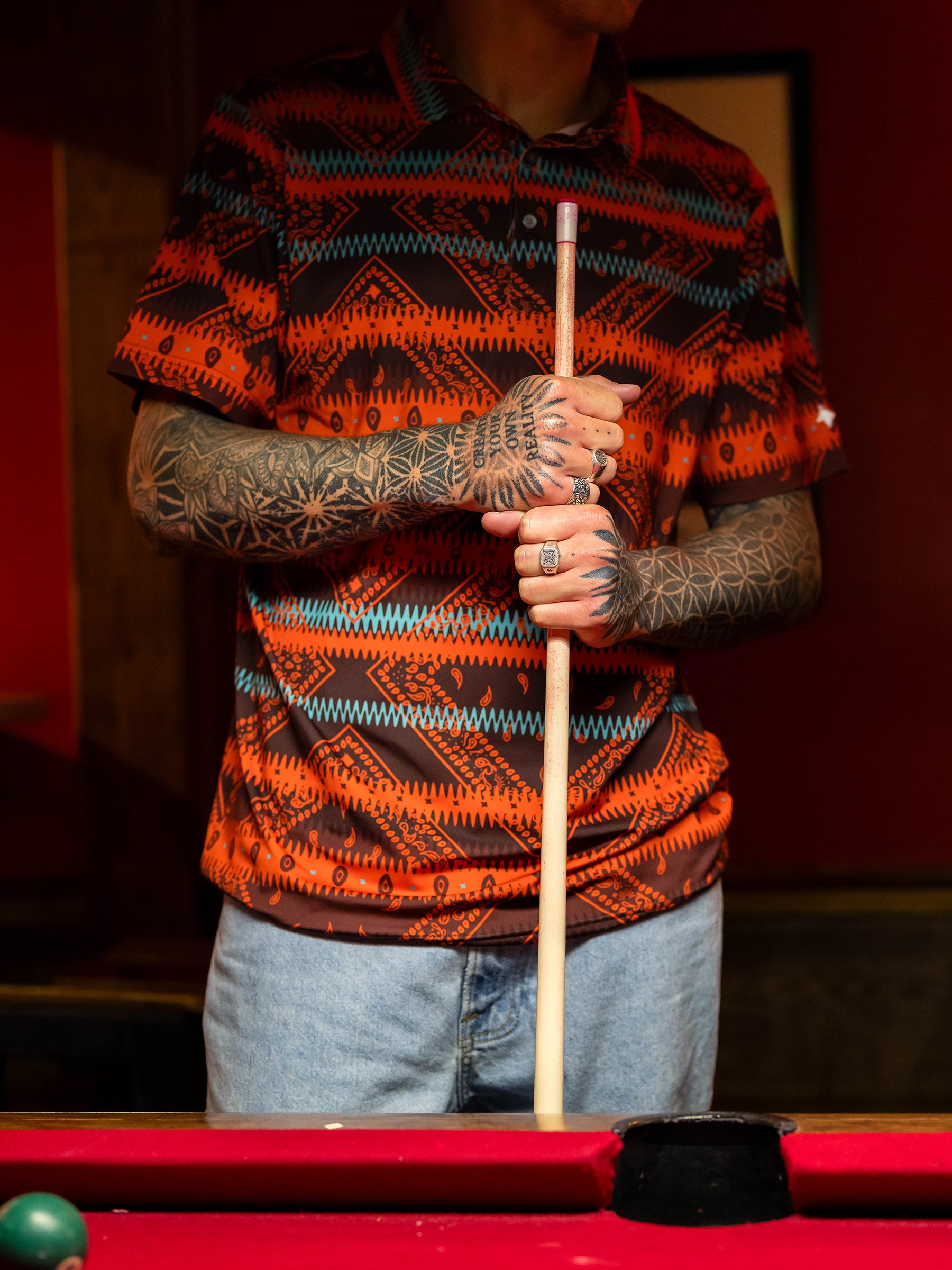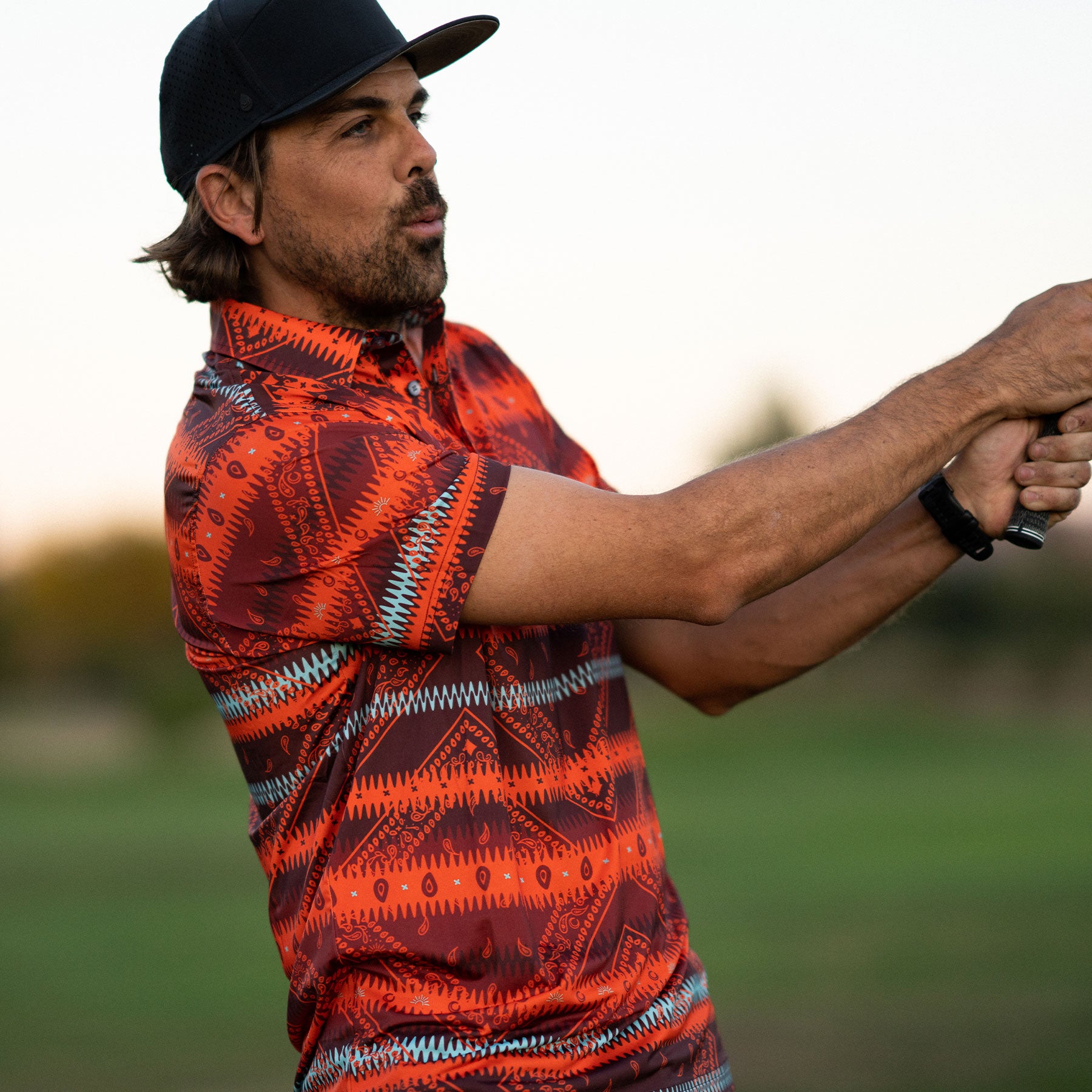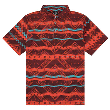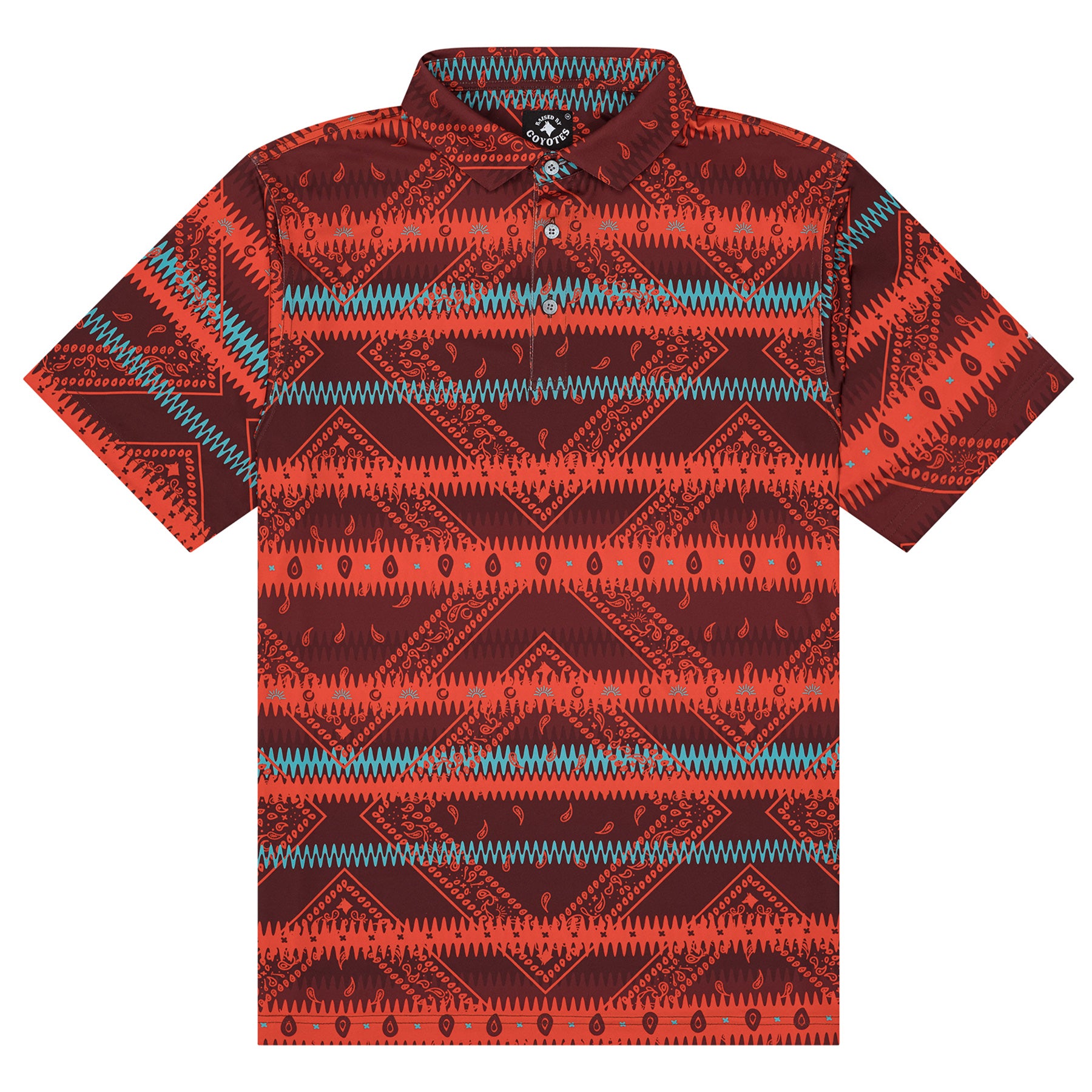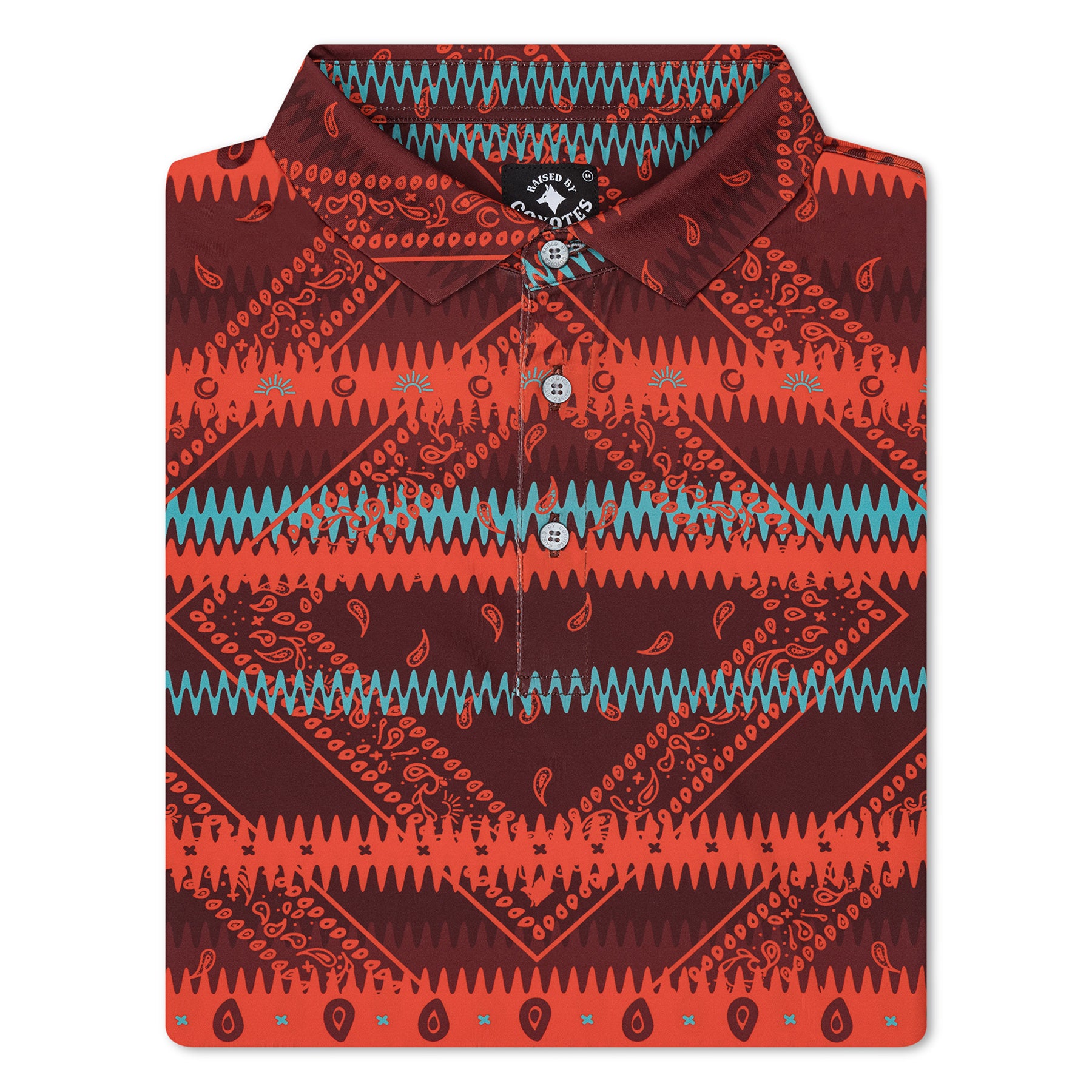 Our Sunset Bandana polo features a southwestern paisley and striped pattern, laser engraved buttons, an embroidered RBC brand logo on the back neck, and our coyote logo on the left sleeve.