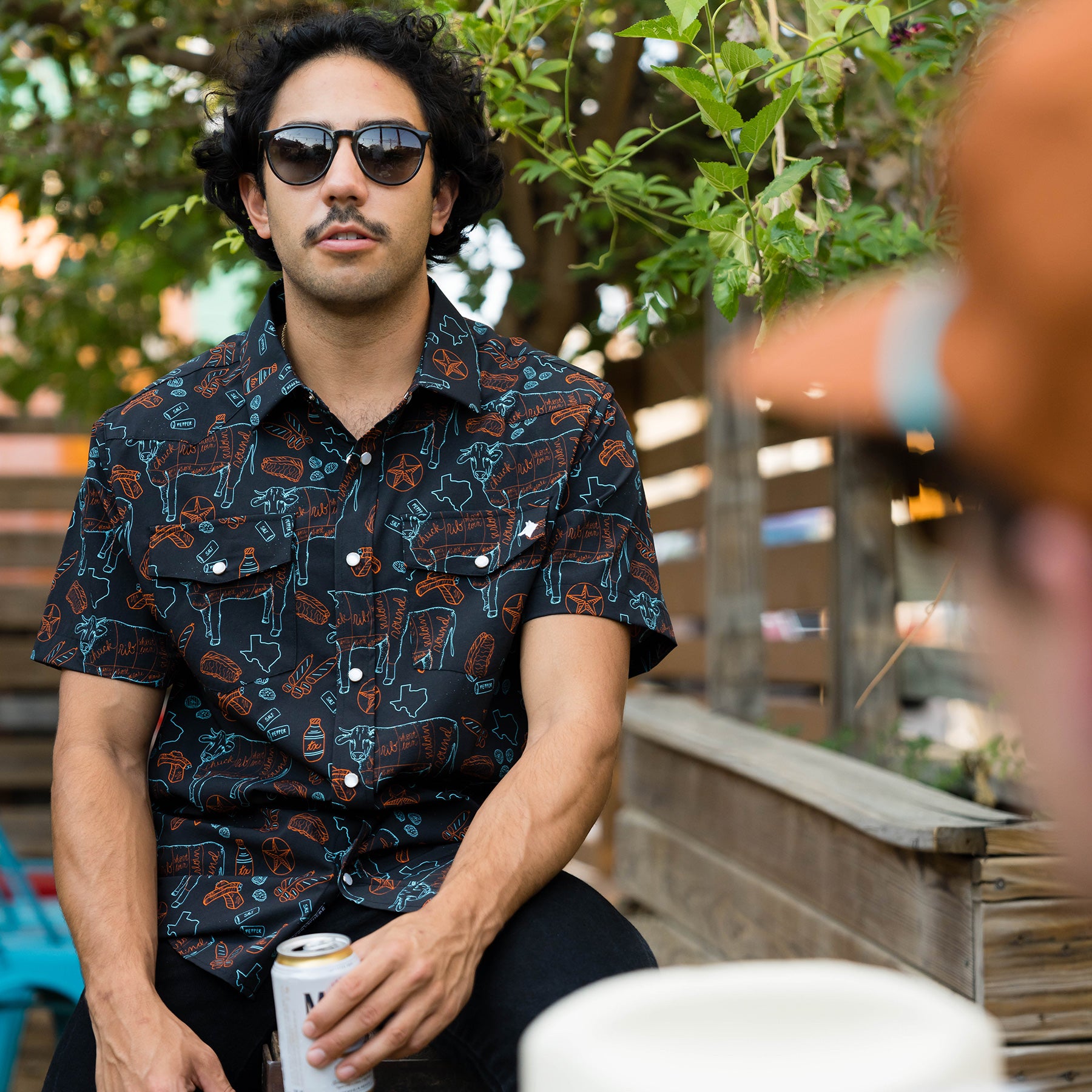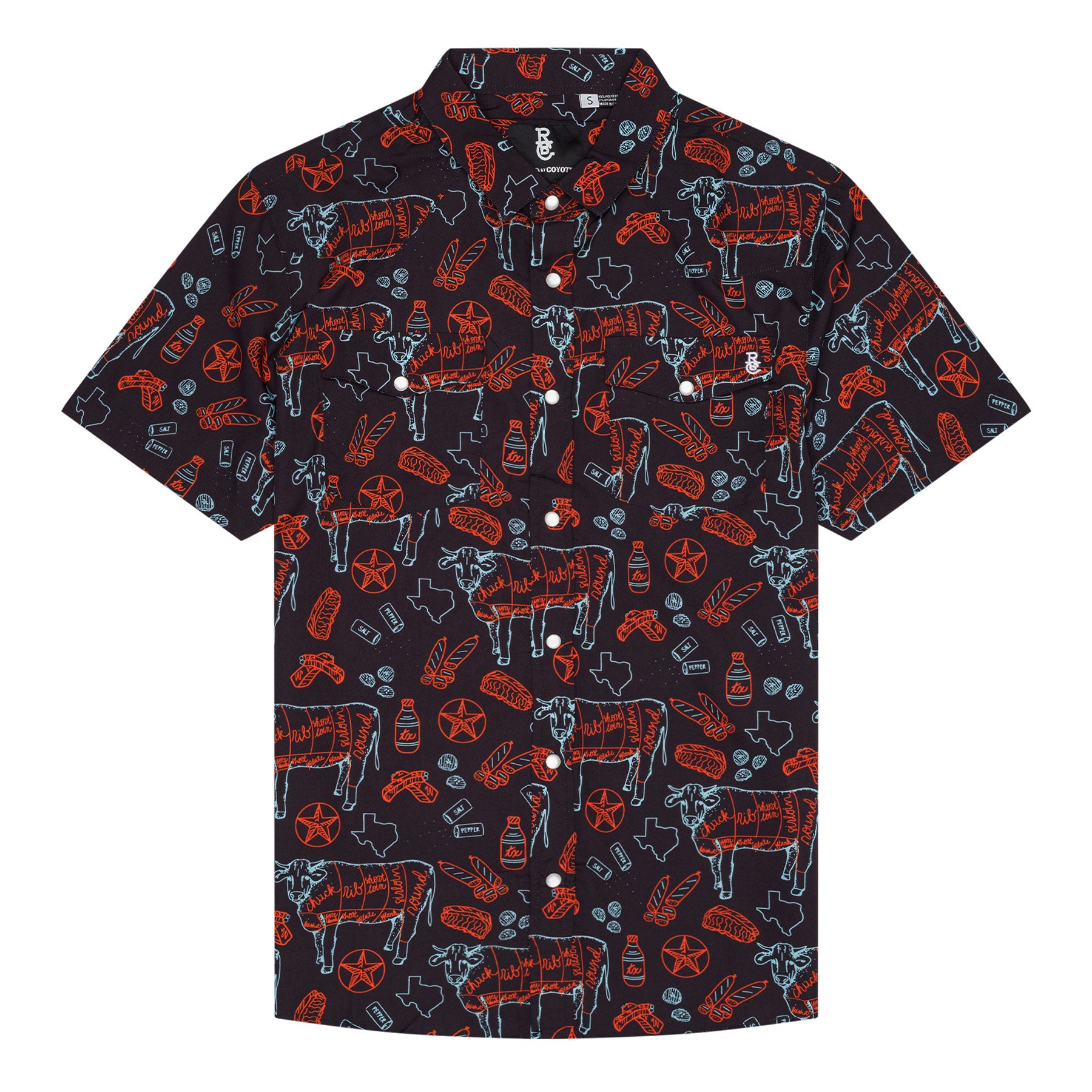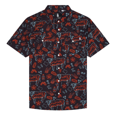 Our TX BBQ Nights pearl snap western shirt features a beef cuts chart, brisket, ribs, sausage and fixin's pattern, pearl snap button down, and embroidered coyote head on the front pocket.